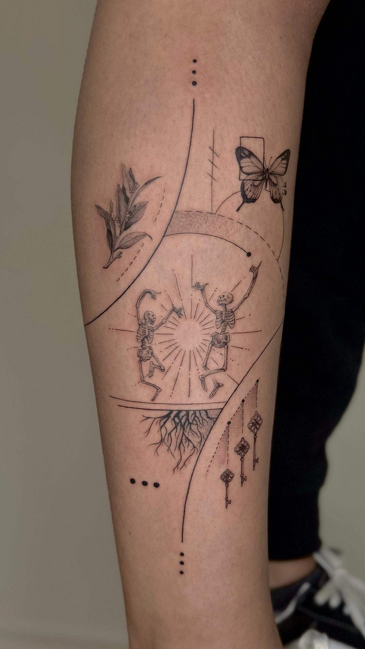 Fine line tree tattoo with roots and geometric elements, symbolizing growth, balance and connection. Tattoo by KORKACH KATERYNA in Porto.