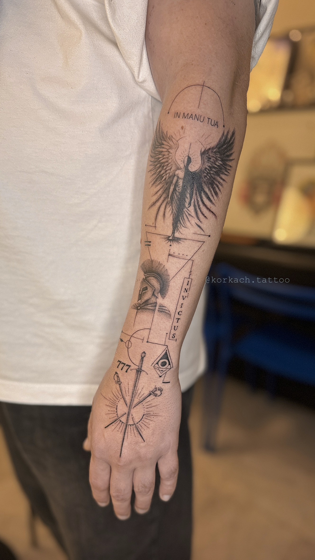 Detailed fine line forearm sleeve tattoo featuring angel wings, sacred geometry, and symbolic elements. Custom tattoo by KORKACH KATERYNA in Porto.