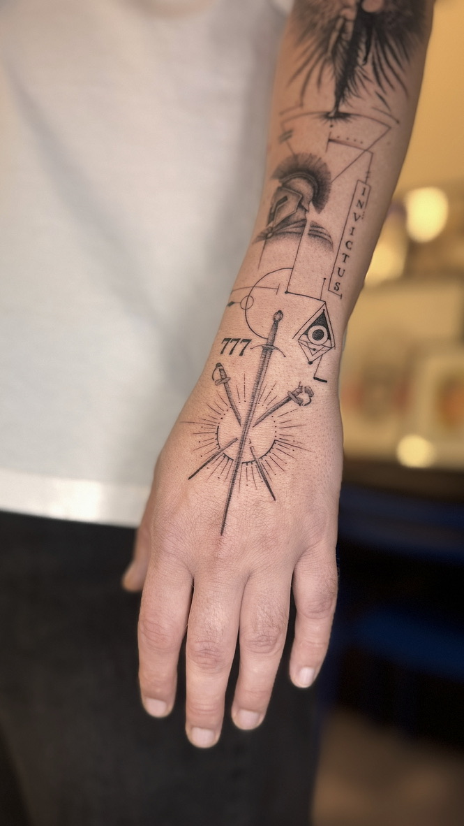 Sacred geometry forearm sleeve tattoo with angel wings – Fine line tattoo in Porto