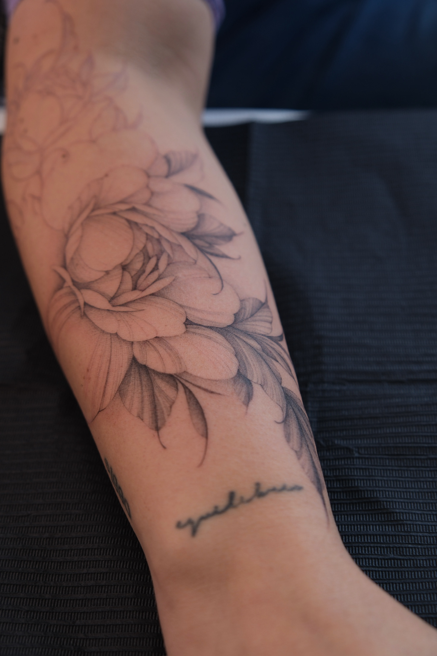 Black and grey peony tattoo on outer forearm done in Porto