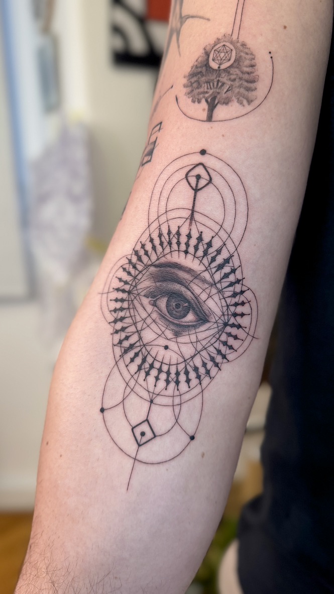 Fine line eye tattoo on forearm with sacred geometry elements, symbolizing awareness, protection and inner vision. Tattoo by KORKACH KATERYNA in Porto.